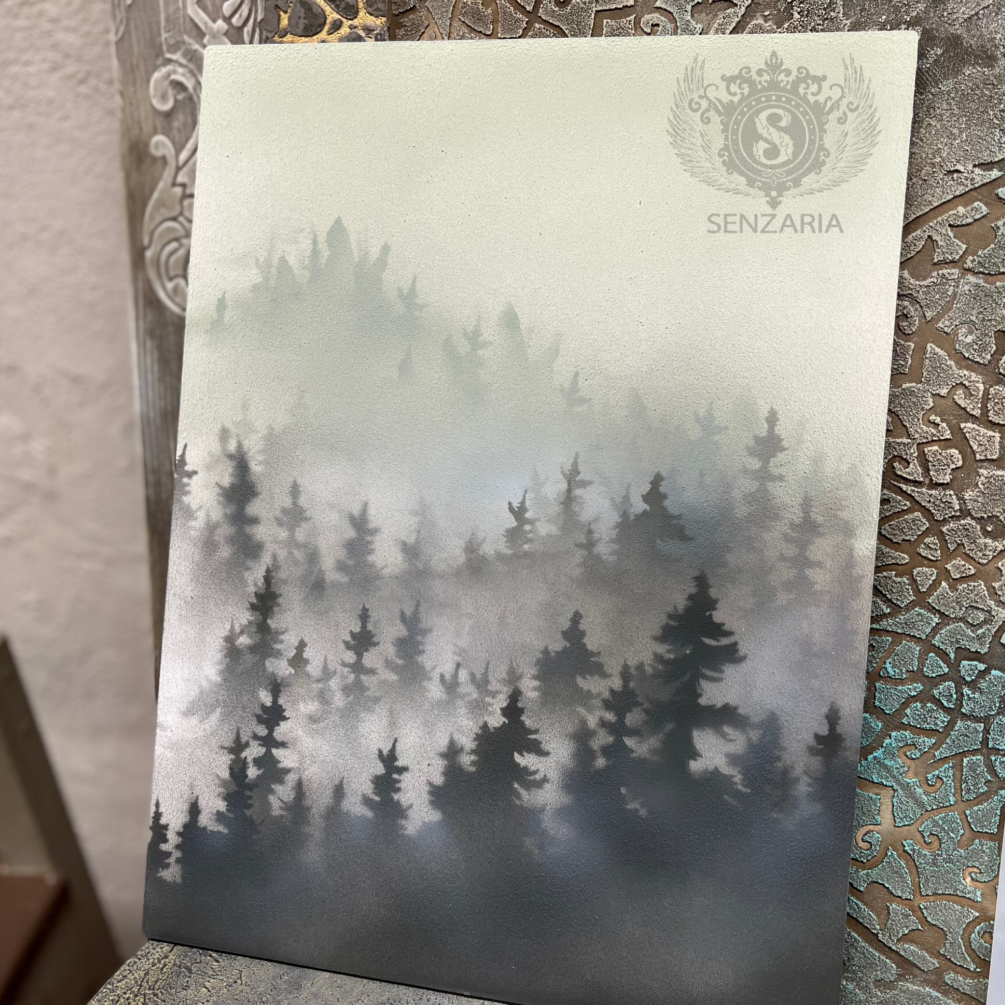 Серия трафаретов для создания самых правдивых туманных горных хвойных лесов в технике градиента. Вы можете использовать тонкие трафареты 0,3мм для нанесения краски спонжем или аэрографом, а так же потолще от 0,7мм для работы со штукатуркой. Трафареты в двух дизайнах из двух частей каждый - вырезка елей внутри поля и отдельная внутренность для создания тумана.